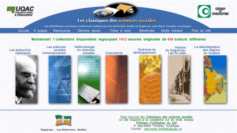 Il y a cinq ans, Jean-Marie Tremblay, professeur de sociologie au cégep de Chicoutimi, a eu l'idée de génie de monter une bibliothèque virtuelle consacrée aux textes classiques en sciences sociales (sociologie, anthropologie, économie, économie politique, sciences politiques, philosophie sociale et politique), pour la plupart introuvables en librairie et même, pour certains, dans les bibliothèques universitaires. Depuis, cette bibliothèque ne cesse de grossir. Elle compte actuellement environ 1500 oeuvres - en français ou en traduction française - de près de 500 auteurs.