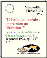 Marc-Adélard Tremblay, “L'évolution sociale: oppression ou libération ?” Un article publié dans la revue La Vie médicale au Canada français, Vol. 1, décembre 1972, pp. 1147-1151. Discours d'ouverture à la Conférence canadienne du bien-être social, tenue à l'Université Laval, Québec, le 18 juin 1972. Ce travail est également publié dans les comptes rendus de la Conférence canadienne du bien-être social. L'auteur était, au moment de la publication de cet article, professeur titulaire d'anthropologie et directeur de l'École des gradués, Université Laval, Québec. Texte téléchargeable !