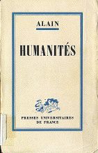 Alain (Émile Chartier) (1868-1951), Humanités (1946). Paris: Les Presses universitaires de France, 1re édition, 1960, 220 pages. Reproduction de la première édition publiée aux Éditions du Méridien, 1946, 286 pages, Collection: Parentés. (Lundi, le 15 septembre 2003)