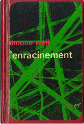 Simone Weil (1909-1943), L'enracinement. Prélude à une déclaration des devoirs envers l'être humain. Paris: Éditions Gallimard, 1949, 382 pages. Collection idées, nrf. (Mardi, le 5 juillet 2005)